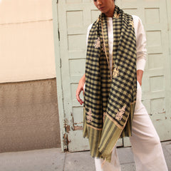 Preciosa pashmina de cashmere tejida y bordada a mano en telares antiguos de cachemira, al norte de la India. El bordado es tan espectacular que no es posible distinguir el derecho del revés. Una obra de arte que normalmente bordan los hombres.