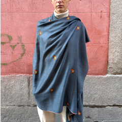 Pieza única en el color verde con bordado pequeño en toda la pashmina de un bouti en tonos naranjas y rojos. Es super fina, suave y abriga muchísimo. Se puede llevar como chal o enrollada al cuello, al ser una lana muy fina no agobia en el cuello.